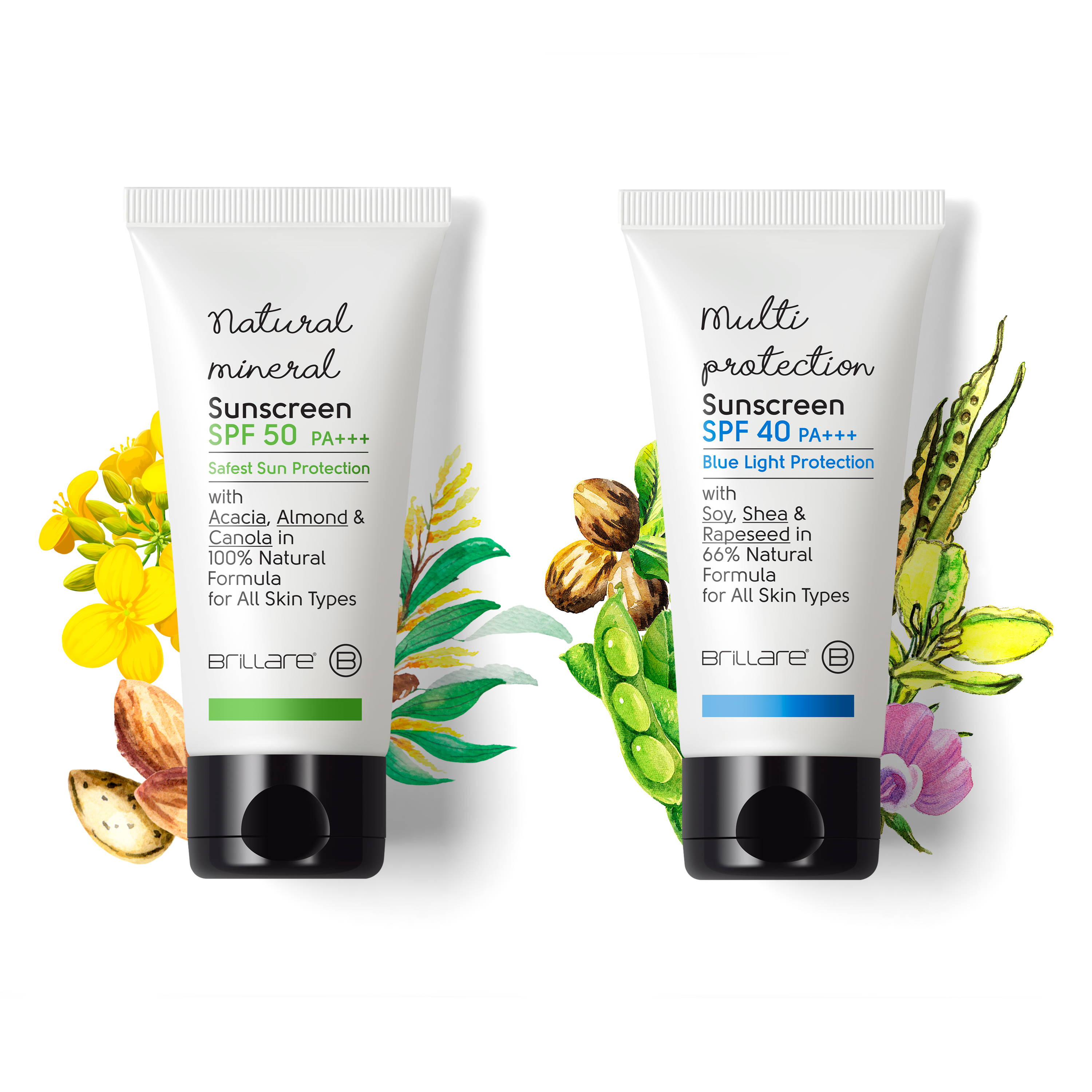 Shelter your skin: UVA and UVB rays are the arrows that pierce the skin and damages the skin cells. Using sunscreen with higher SPF works as armour for the skin. One of the vital things to keep in mind while purchasing sunscreen is to check for PA+++ in sunscreen, which represents sunscreen protection against ageing rays. Brillare offers sunscreen in two options. One for the category of people who prefer natural ingredients, the natural mineral sunscreen SPF 50 (perfect for sensitive skin!), and the other for people who are more exposed to digital gadgets, the multi-protection sunscreen SPF 40 with blue light protection.